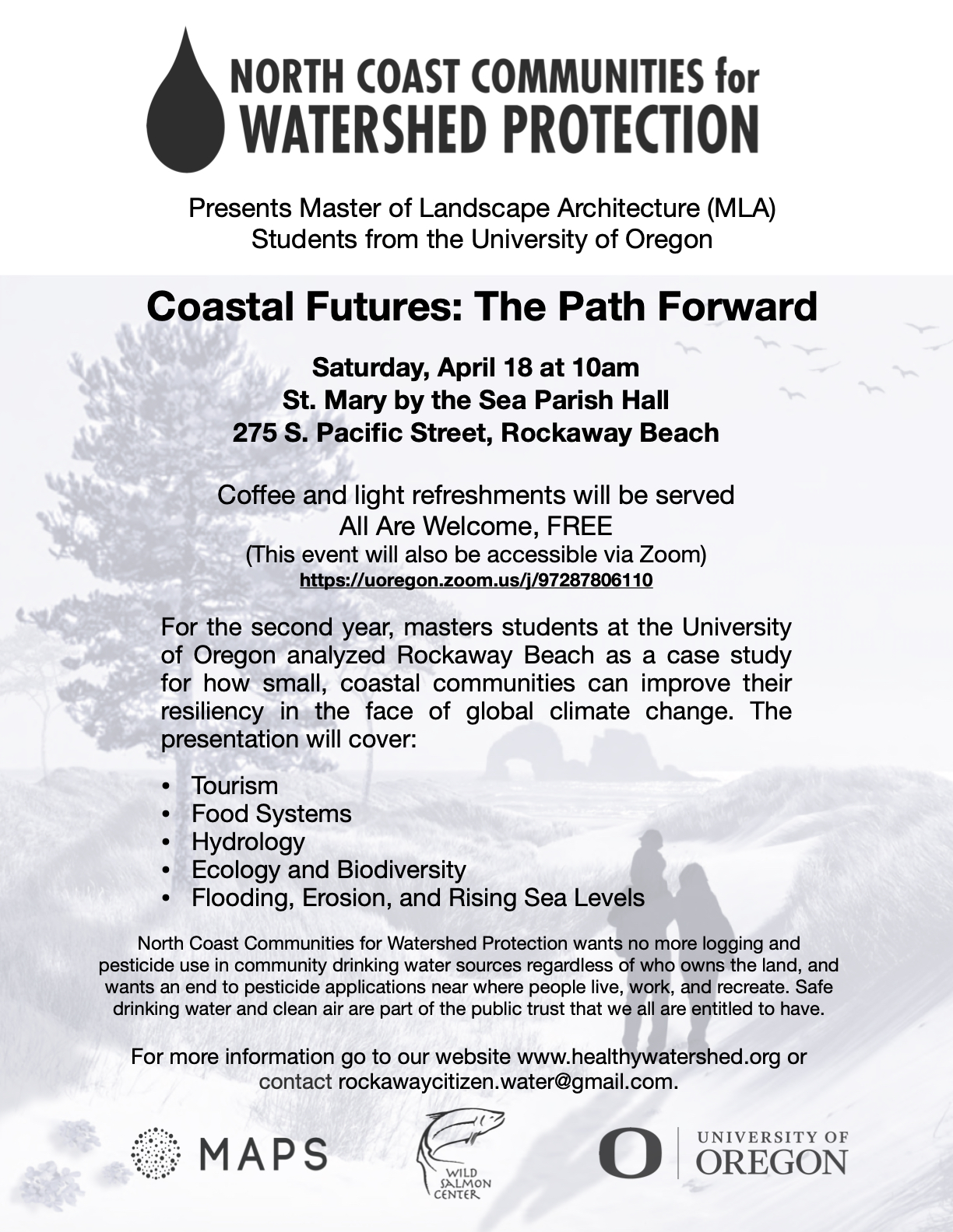 North Coast Communities for Watershed Protection again will be holding regular monthly meetings the last Tuesday of each month. Meetings will take place starting at 6:00 p.m. and going until about 7:00 p.m. at the St. Mary by the Sea Parish Hall; 275 S. Pacific St.; Rockaway Beach, Or 97136.