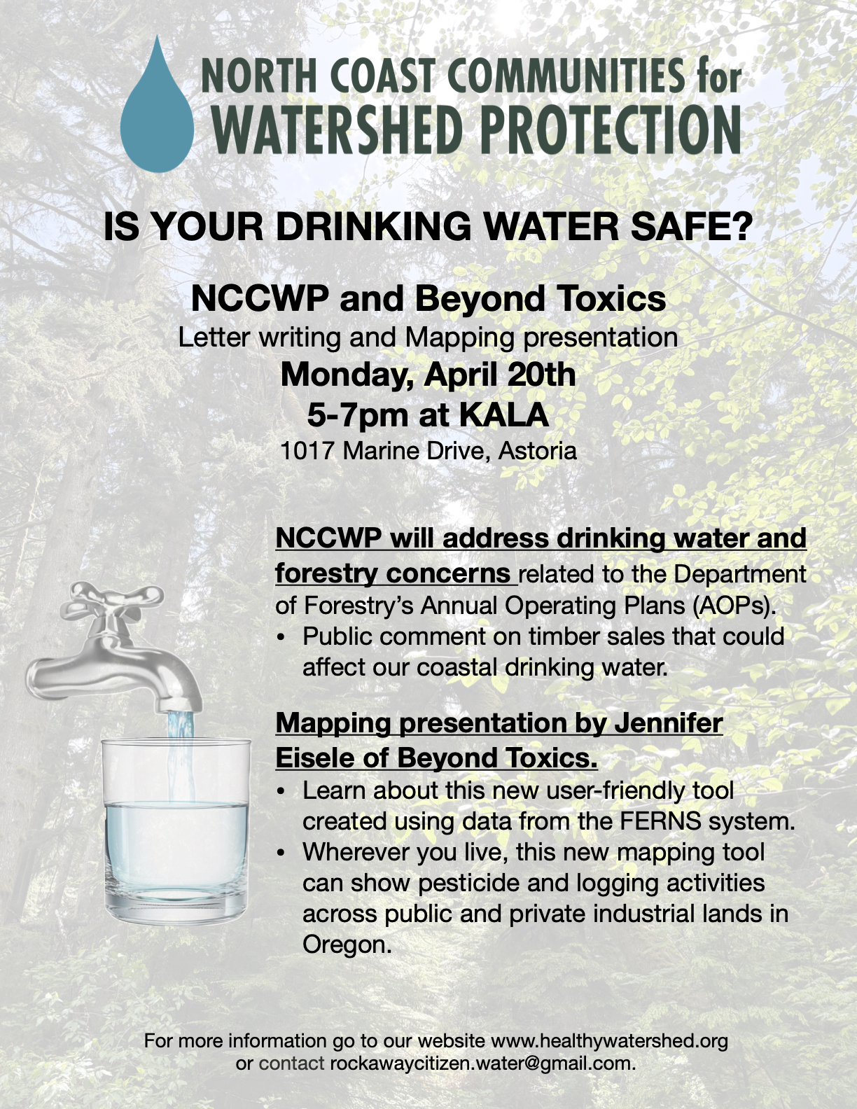 North Coast Communities for Watershed Protection (NCCWP) is a grass-roots association of citizens from Rockaway Beach and surrounding communities. The group began in 2012 with the actions of one Rockaway citizen concerned about clear cutting for forestland and aerial spraying in the Jetty Creek Watershed - the sole source of her community's drinking water.
